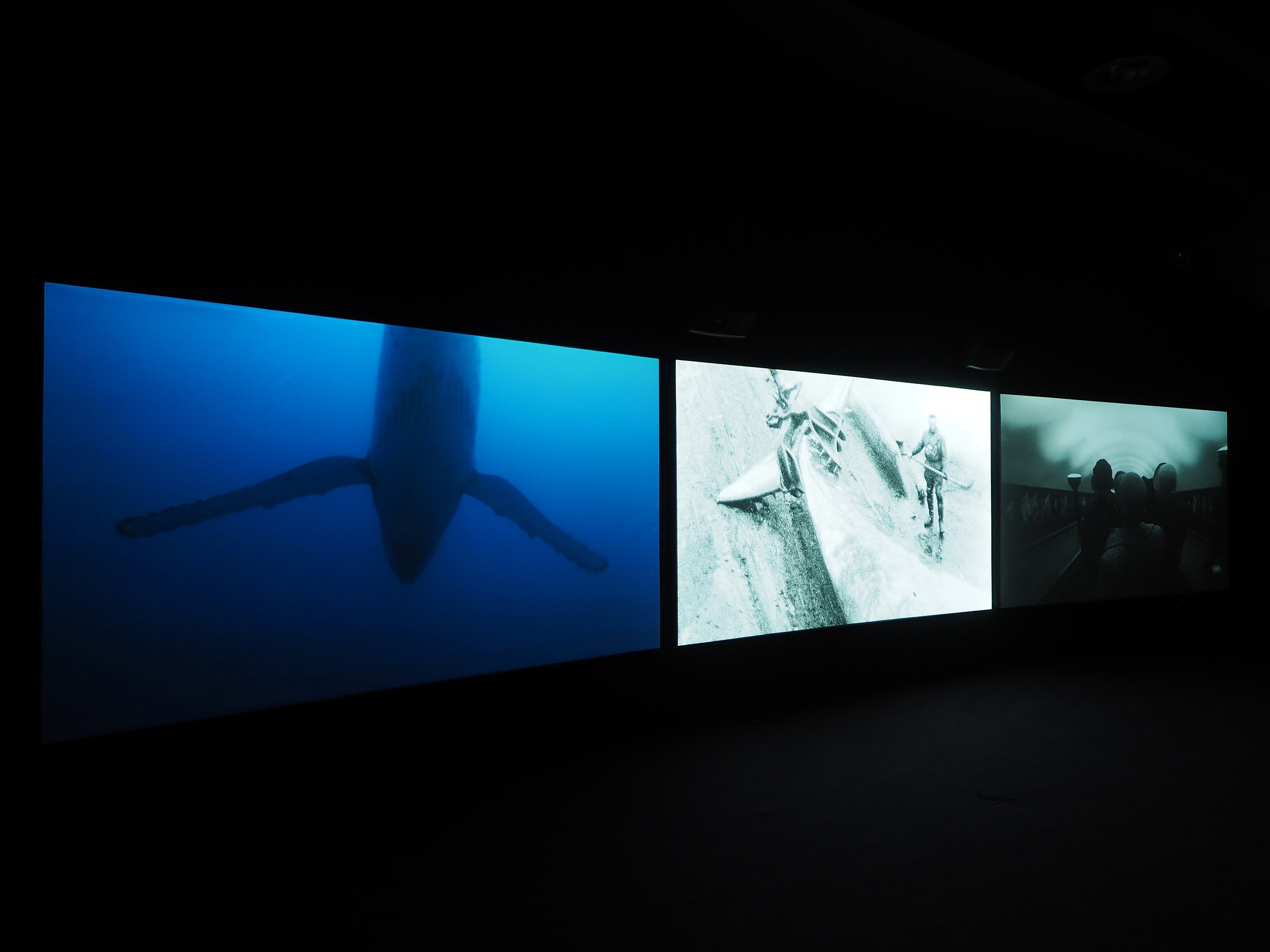 Vertigo Sea è la prima grande installazione video presente in mostra. L’artista John Akomfrah ha realizzato un’opera che, grazie a grandi e ipnotiche immagini a colori proiettate su tre canali in HD 2K, consente al pubblico di essere coinvolto intorno alle molteplici tematiche sollevate dagli ambienti marini, dallo sfruttamento delle risorse naturali alle migrazioni forzate, dalla biodiversità al pericolo che l’inquinamento ne riduca la ricchezza. Il retro della parete che ospita la video installazione ospita alcuni oggetti d’epoca, come cannocchiali provenienti dal Museo del Mare di Genova, banconote e assegni emessi dalle baleniere tra Ottocento e Novecento, insieme all’opera realizzata appositamente per la mostra con tre edizioni americane di Moby Dick arpionate da Elisabetta Benassi.