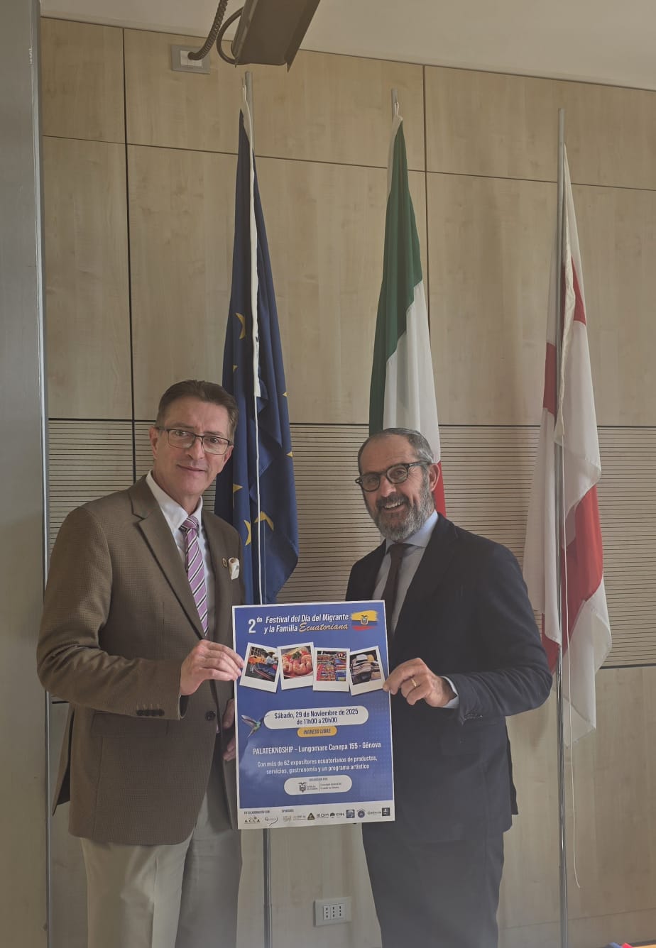 Nel corso della visita, il console Izquierdo ha illustrato la seconda edizione del “Festival della Giornata del Migrante e della Famiglia Ecuadoriana”, che si terrà sabato 29 novembre, dalle 11 alle 20, al Palateknoship di lungomare Canepa. L’amministrazione comunale riconosce a questo appuntamento un ruolo importante nel promuovere l’incontro tra culture e nel consolidare il senso di appartenenza delle diverse comunità che contribuiscono alla vita sociale e civile di Genova.