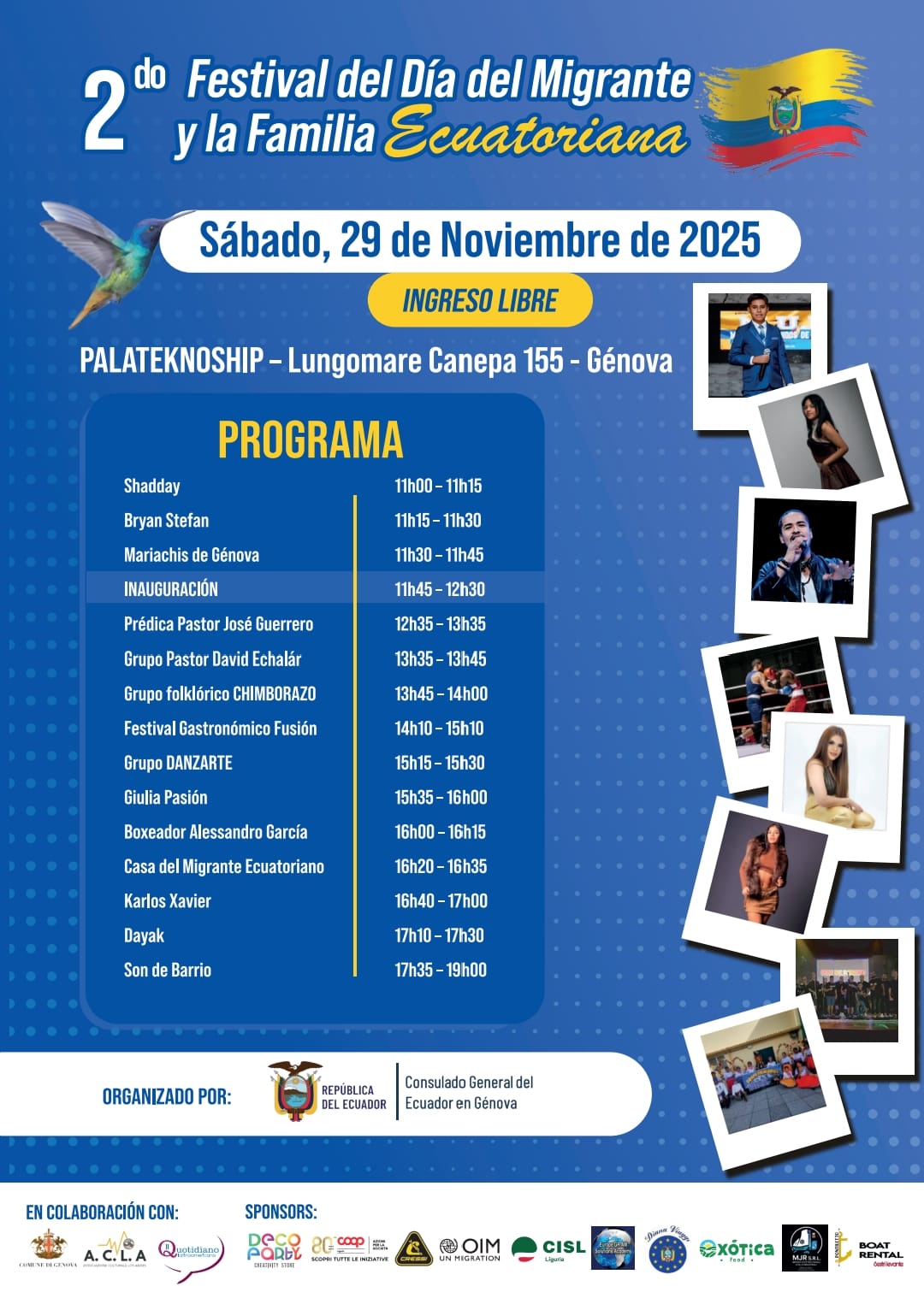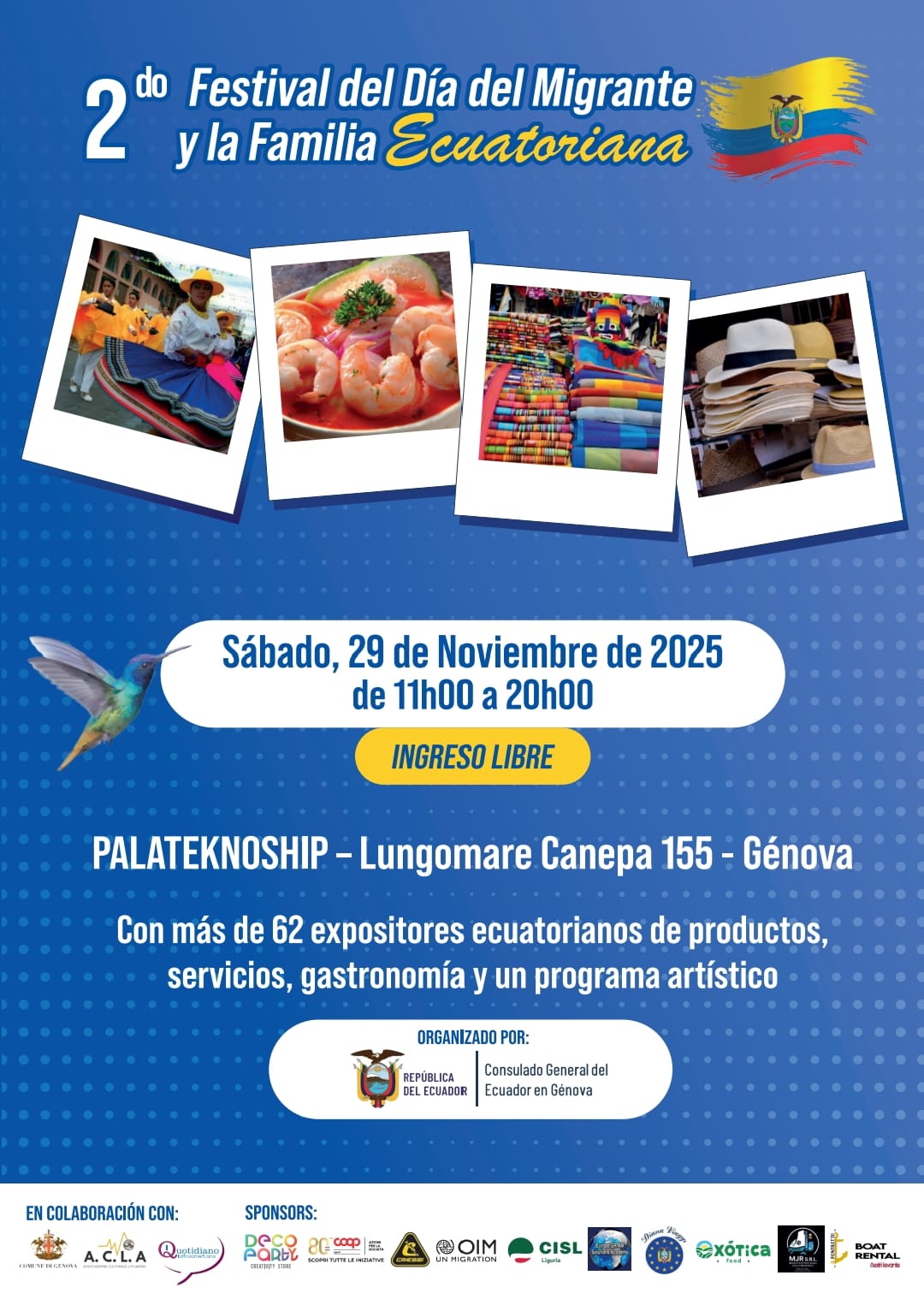 Il festival, che prosegue l’esperienza avviata l’anno scorso, conferma la propria natura inclusiva grazie all’ingresso gratuito, pensato per consentire la partecipazione del maggior numero possibile di cittadini. La manifestazione offrirà un’occasione concreta per conoscere da vicino le tradizioni, le attività economiche e i percorsi di integrazione della comunità ecuadoriana. Più di sessanta espositori presenteranno specialità gastronomiche, artigianato, servizi e proposte turistiche, offrendo un quadro fedele della creatività e della capacità imprenditoriale che caratterizzano la presenza ecuadoriana sul territorio genovese.