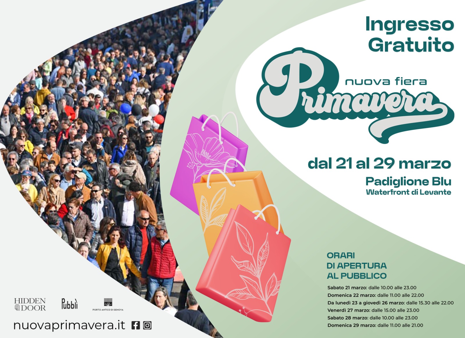 Nuova Fiera Primavera torna a Genova in una veste completamente rinnovata e apre ufficialmente al pubblico da sabato 21 a domenica 29 marzo negli spazi del Padiglione Blu e nelle aree esterne dell’ex quartiere fieristico. Per nove giorni, questo affaccio sul mare si trasformerà in una grande vetrina dedicata a design, artigianato, moda, automotive, giardinaggio, gastronomia e tempo libero, con ingresso gratuito per tutti i visitatori.