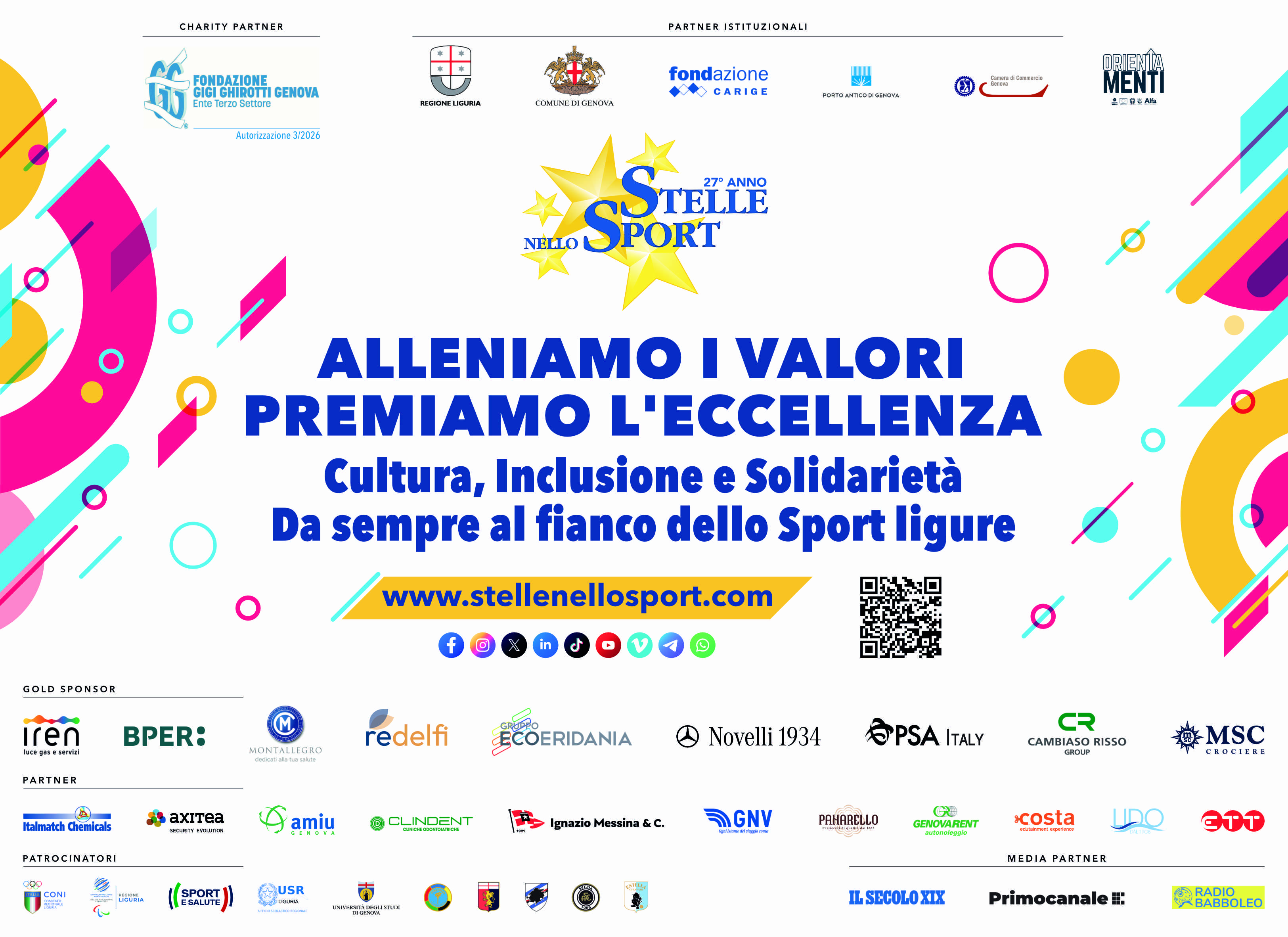 Un impegno al fianco di federazioni e associazioni sportive, scuole ed istituzioni, portato avanti grazie al sostegno di Comune di Genova, Regione Liguria  e Fondazione Carige, le sinergie istituzionali con Porto Antico, Camera di Commercio di Genova e Orientamenti, il contributo di numerosi sponsor e il patrocinio di Coni, Cip, Sport e Salute, Usr Liguria, Università di Genova, Panathlon, Genoa Cfc, Uc Sampdoria, Ac Spezia e Virtus Entella.