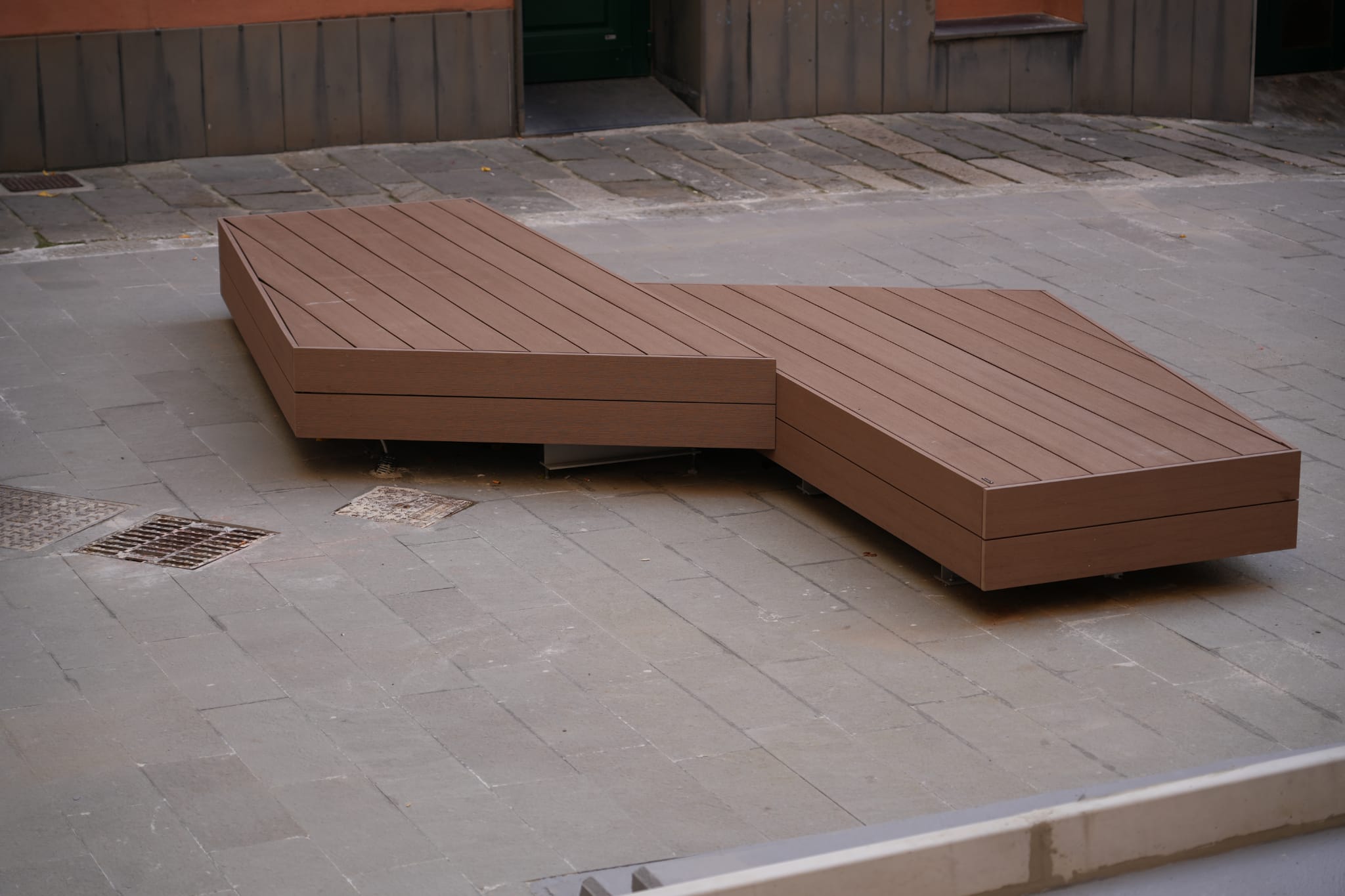 Nella porzione a sud della piazza in piano è stata allestita una grande piattaforma differenziata come pavimentazione che, pur rimanendo a raso alla stessa quota di calpestio della pavimentazione in arenaria, permette di delimitare ed allestire una sorta di teatro all’aperto per poter fruire dello spazio anche in occasione di eventi culturali, quali assistere a conferenze, spettacoli o proiezioni di film e video.
