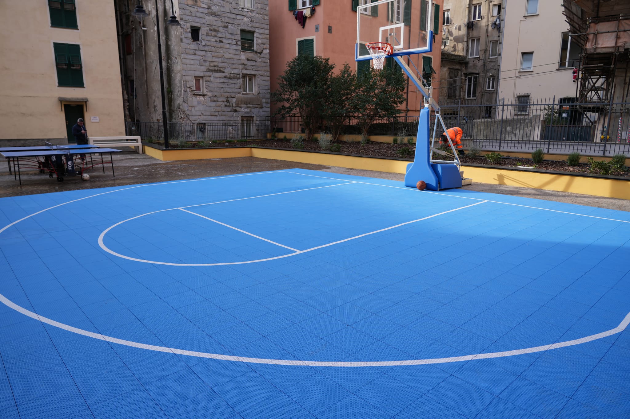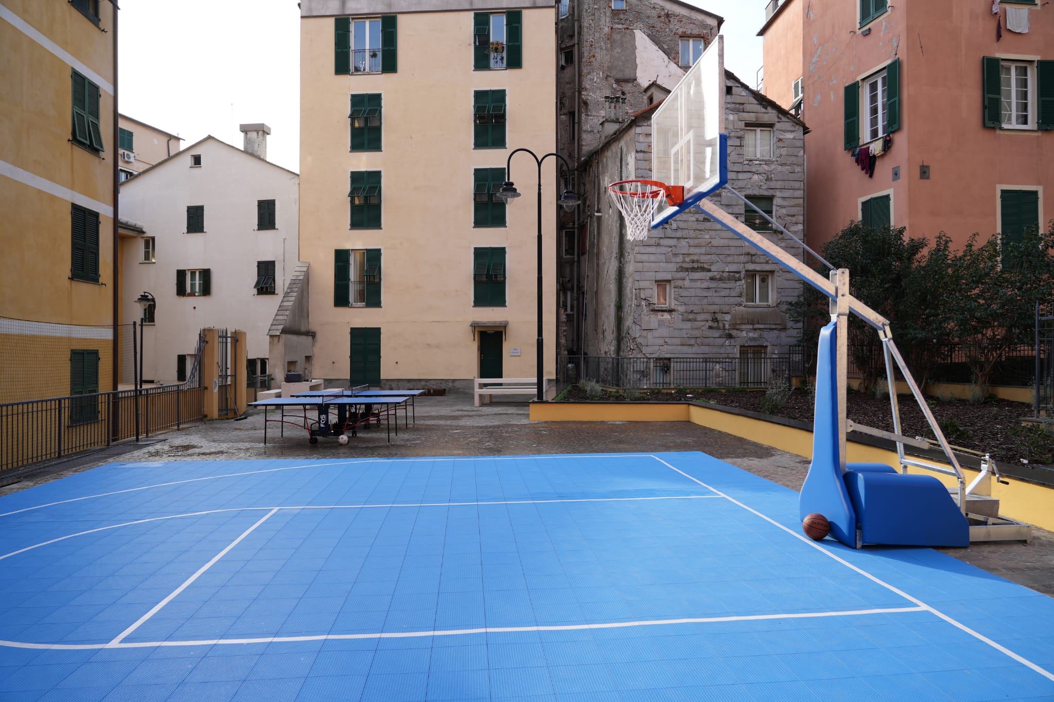 A protezione delle nuove attività inserite sulla piazza, è stata implementata una recinzione in rete anti-pallone autoportante su elementi prefabbricati in metallo posti al contorno dei campi da gioco.