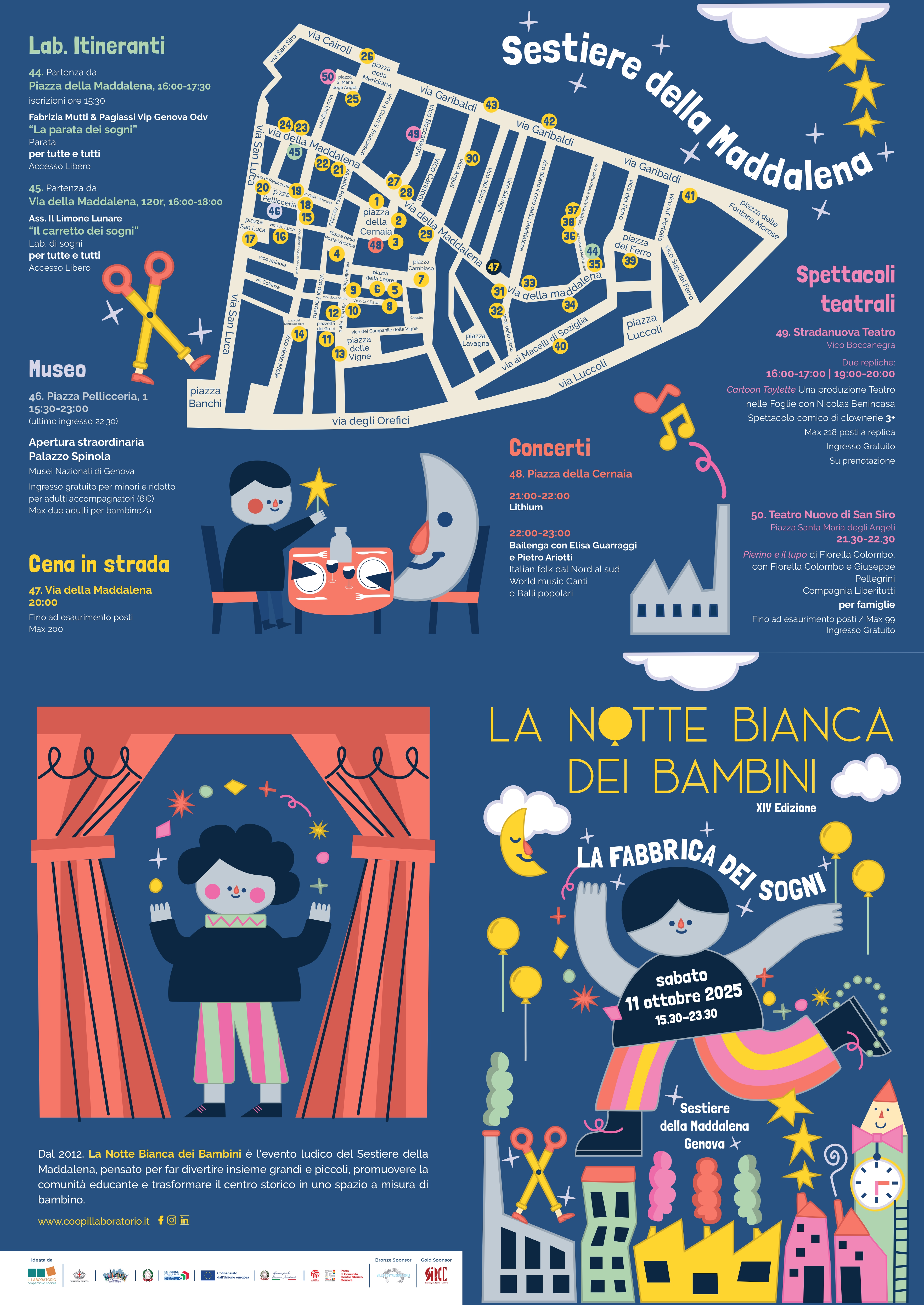 L’iniziativa de “La notte bianca dei bambini” nasce e si sviluppa nel Progetto di Comunità del Centro Storico, una partnership tra Comune di Genova e 93 associazioni del territorio. L’evento, infatti, è realizzato all’interno del Progetto di Comunità Centro Storico, cofinanziato dal Comune di Genova e sostenuto con dal contributo economico delle aziende SIRCE e Villa Costruzioni.