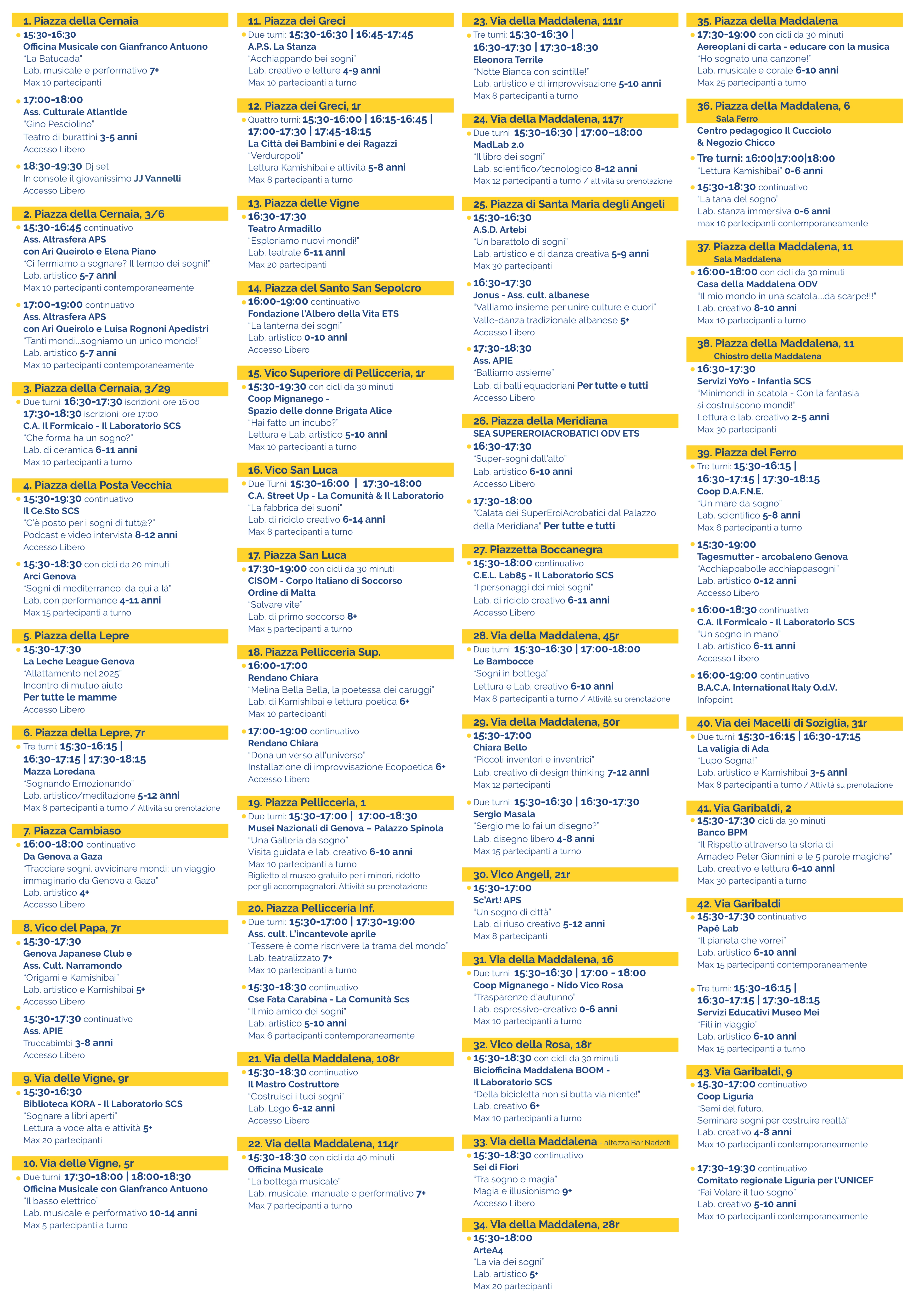 Alle 17, invece, l’assessora al Welfare Cristina Lodi seguirà il tour per le strade e le piazze animate dalla Notte bianca, con partenza dall’Agenzia per la famiglia a Palazzo Tursi per proseguire in piazza della Meridiana (dove si esibiranno i supereroi acrobatici), piazza santa Maria degli Angeli (danze etniche), via della Maddalena, piazza Cernaia e via delle Vigne.