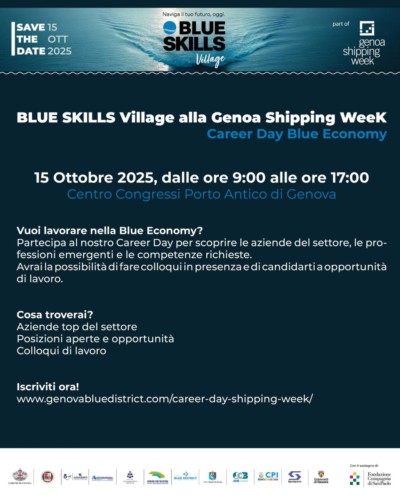 Mercoledì 15 ottobre, dalle ore 9 alle 17, presso il Centro Congressi del Porto Antico di Genova – Foyer Grecale, si terrà il Career Day del Blue Skills Village, l’appuntamento dedicato alla Blue Economy e alle opportunità professionali del mare, organizzato nell’ambito della Genoa Shipping Week 2025, la manifestazione internazionale che riunisce il mondo marittimo, logistico e portuale. Il Blue Skills Village è promosso dal Job Centre, società in house del Comune di Genova, e dal Genova Blue District, con il coinvolgimento di: Comune di Genova, Regione Liguria (tramite i Centri per l’Impiego), Università di Genova, Accademia della Marina Mercantile, Istituto Nautico San Giorgio, Assiterminal, Assagenti, Spediporto, Confindustria Nautica e Genova for Yachting.