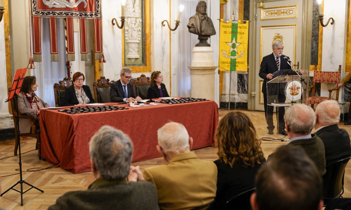 Si è svolta ieri pomeriggio, nel Salone di Rappresentanza di Palazzo Tursi, la cerimonia istituzionale di premiazione dei 26 “Maestri del Lavoro”, nominati dal Presidente della Repubblica, nel 2024 e nel 2025, a cui è stato conferito il Genovino d’argento come riconoscimento per essersi distinti nel mondo del lavoro. Alla cerimonia hanno partecipato l’assessore al Lavoro del Comune di Genova, Emilio Robotti, il console provinciale di Genova, Maria Rosaria Esposito Venezia, e il Console Emerito Federazione Nazionale Maestri del Lavoro, Fausto Lodi.