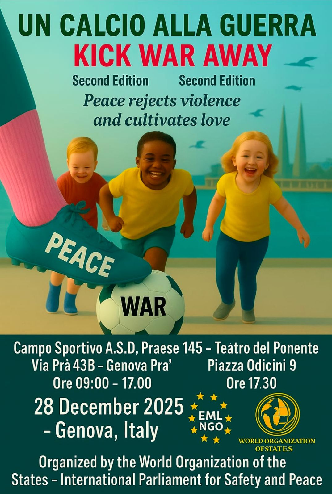Presentata, questa mattina, nel Salone di Rappresentanza di Palazzo Tursi, la seconda edizione della manifestazione internazionale “Un Calcio alla Guerra – Kick War Away”, organizzata dalla European Muslims League (EML) con l’Alto Patrocinio della World Organization of the States – International Parliament for Safety and Peace (WOS-IPSP), organizzazione intergovernativa riconosciuta a livello internazionale.