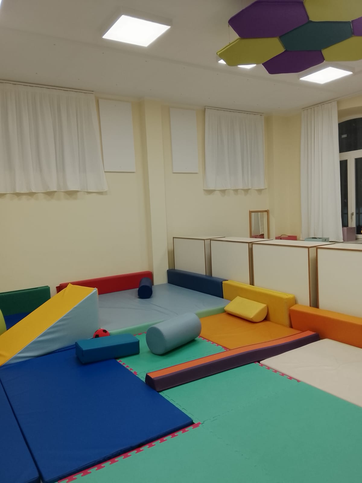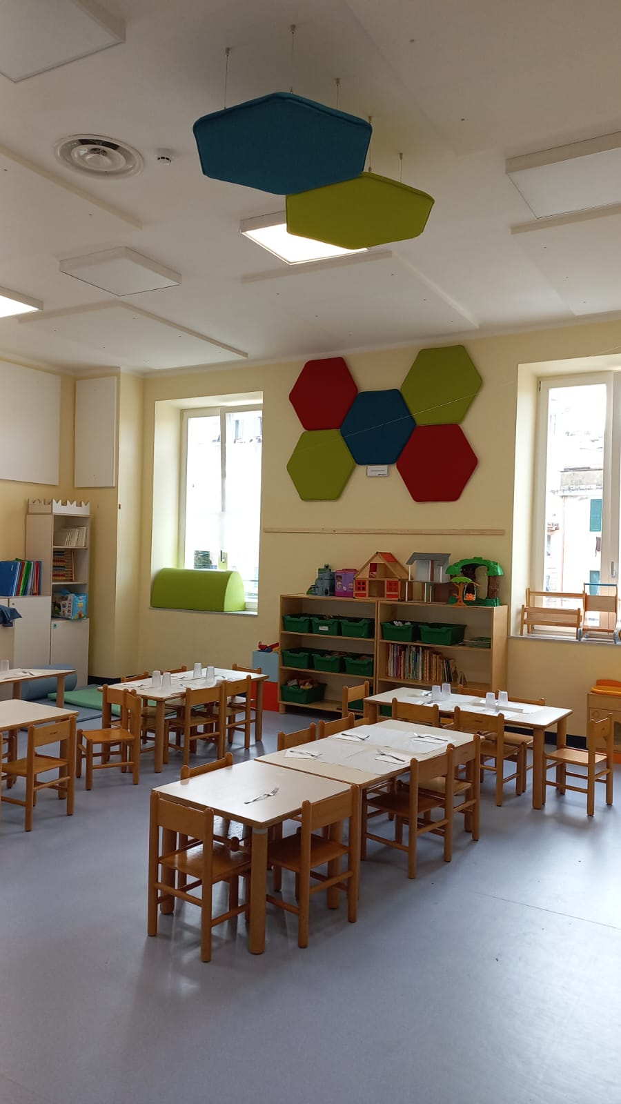 Grandi spazi luminosi e classi arredate con materiali nuovi e curati ospitano i bambini in un ambiente stimolante e colorato. Sono presenti tre sezioni, un'aula di psicomotricità attrezzata con percorsi morbidi e materiali specifici, diversi spazi laboratorio per lettura, attività grafico-pittorica, giochi in piccolo gruppo.