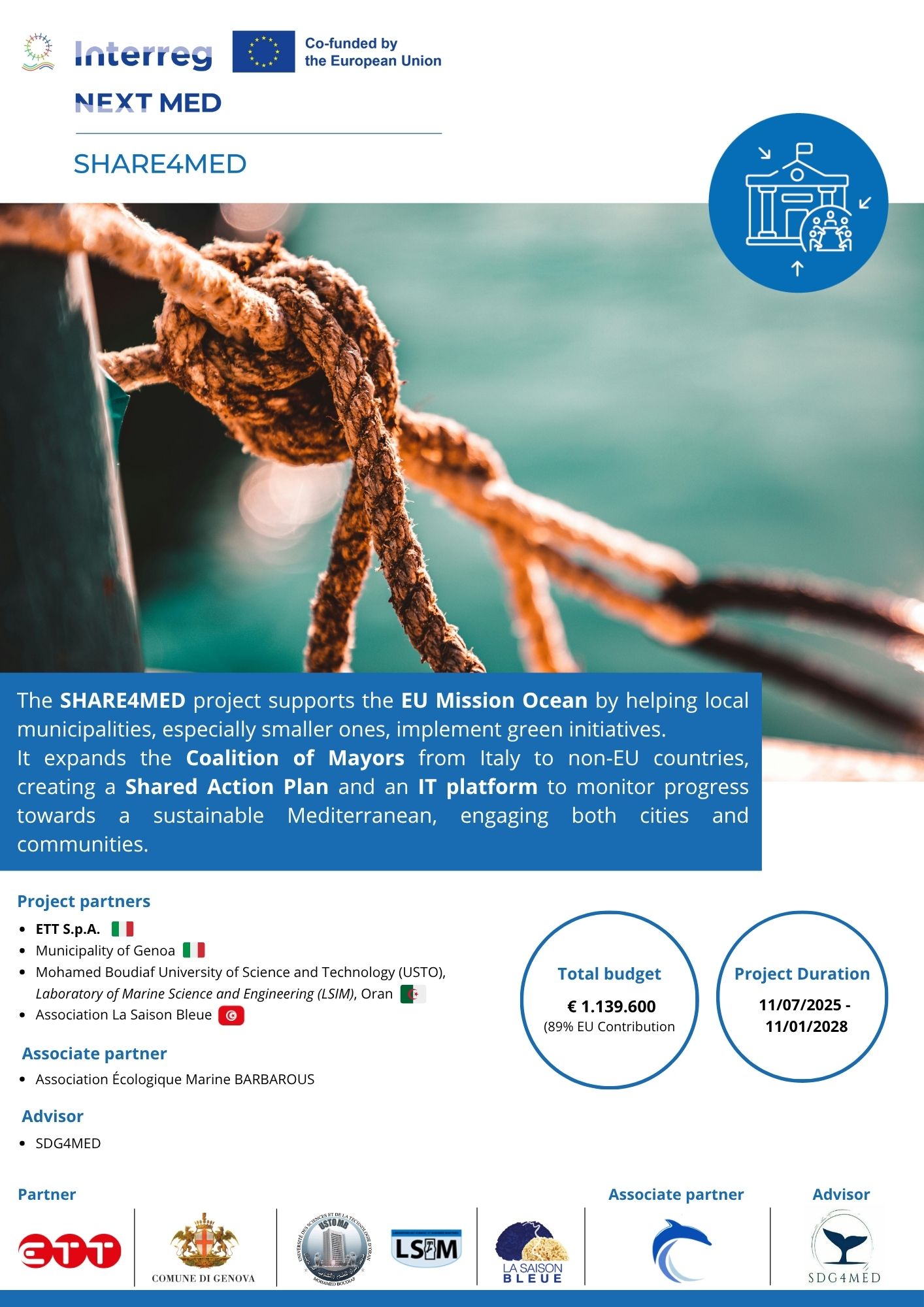 Il progetto SHARE4MED sostiene la Missione Oceano dell’UE, aiutando i piccoli comuni nell’attuazione di iniziative green. Il progetto mira a espandere la Coalizione dei Sindaci dall’Italia ai Paesi non UE, creando un piano d’azione e una piattaforma IT condivisi per favorire il progresso verso un Mediterraneo sostenibile e coinvolgendo le città e le comunità locali.