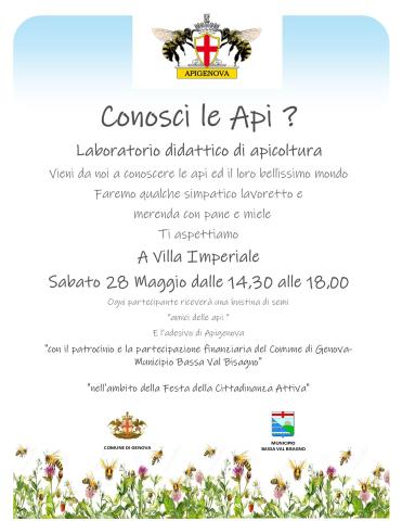 Nell'ambito della Festa della Cittadinanza Attiva Sabato 28 maggio 2022 ore 14.30 Villa Imperiale: Conosci le Api? - laboratorio didattico di apicoltura a cura dell'Associazione "ApiGenova".