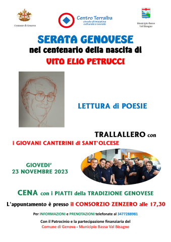 Serata Genovese: nel centenario della nascita di Vito Elio Petrucci, Giovedì 23 novembre 2023, il Centro Culturale Terralba organizza una lettura di poesie accompagnata da un'esibizione di Trallallero dei Giovani Canterini di Sant'Olcese. Cena conclusiva con piatti della tradizione genovese.