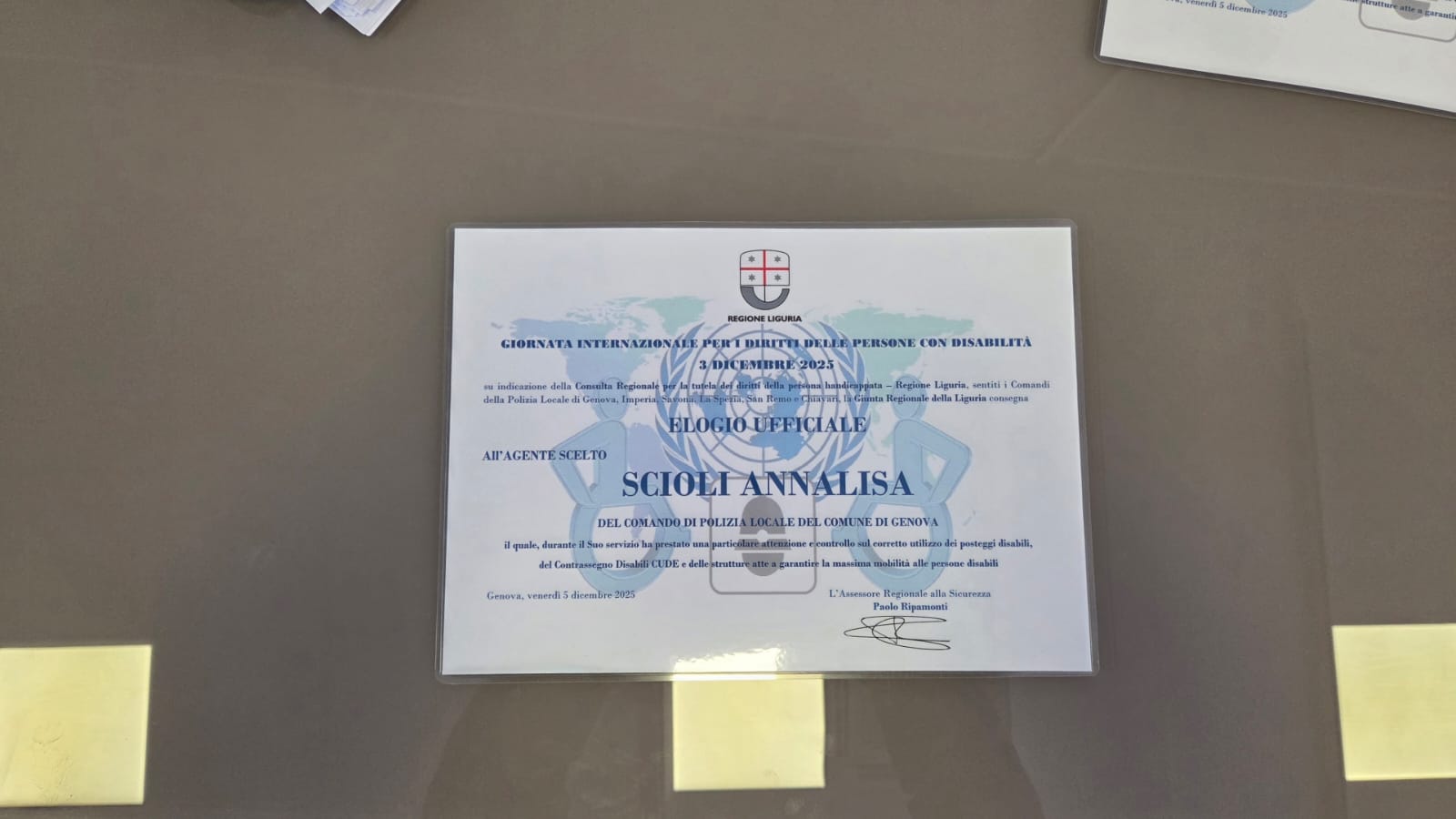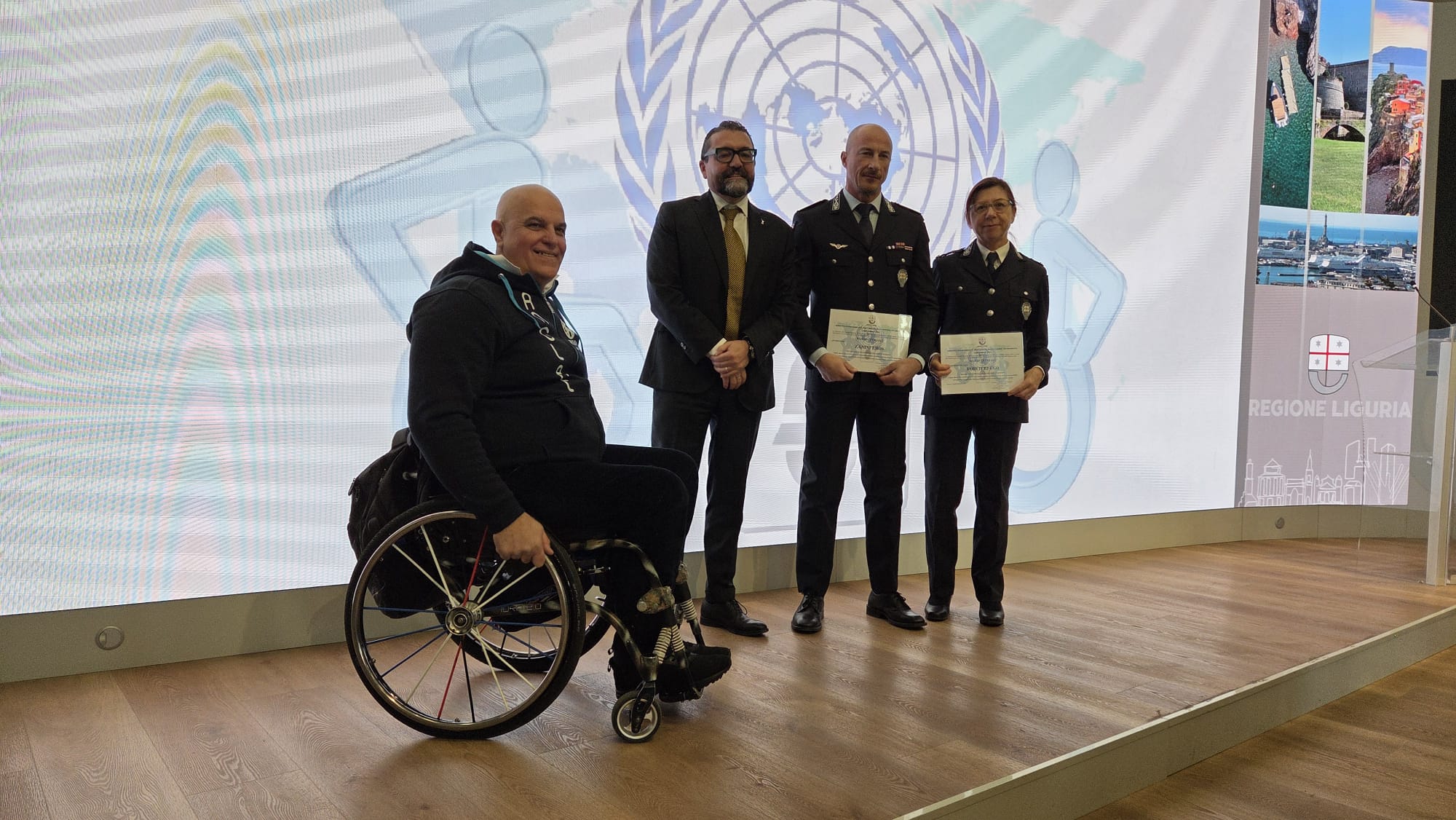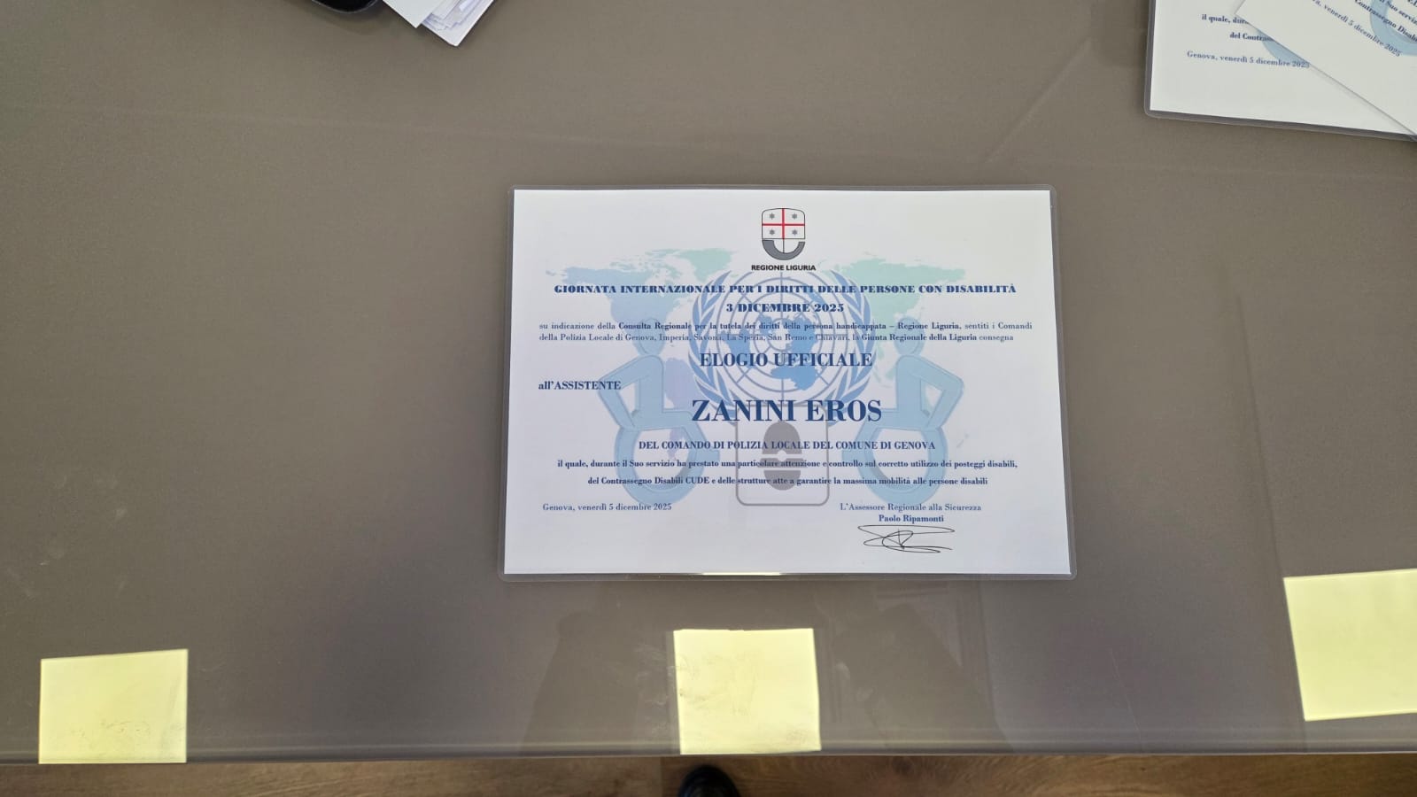 A pochi giorni dalla Giornata Internazionale delle Persone con Disabilità, celebrata il 3 dicembre, la Sala Trasparenza della Regione Liguria è diventata il palcoscenico dell'annuale cerimonia di conferimento degli elogi ad agenti delle Polizie Locali che, durante l'anno in corso, si sono distinti per l'impegno a tutela dei diritti delle persone con disabilità; fra loro, tre componenti del Corpo di Genova: Ugo Forcieri, Annalisa Scioli ed Eros Zanini.