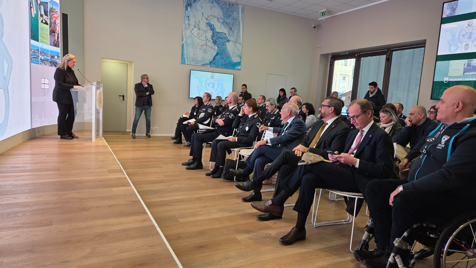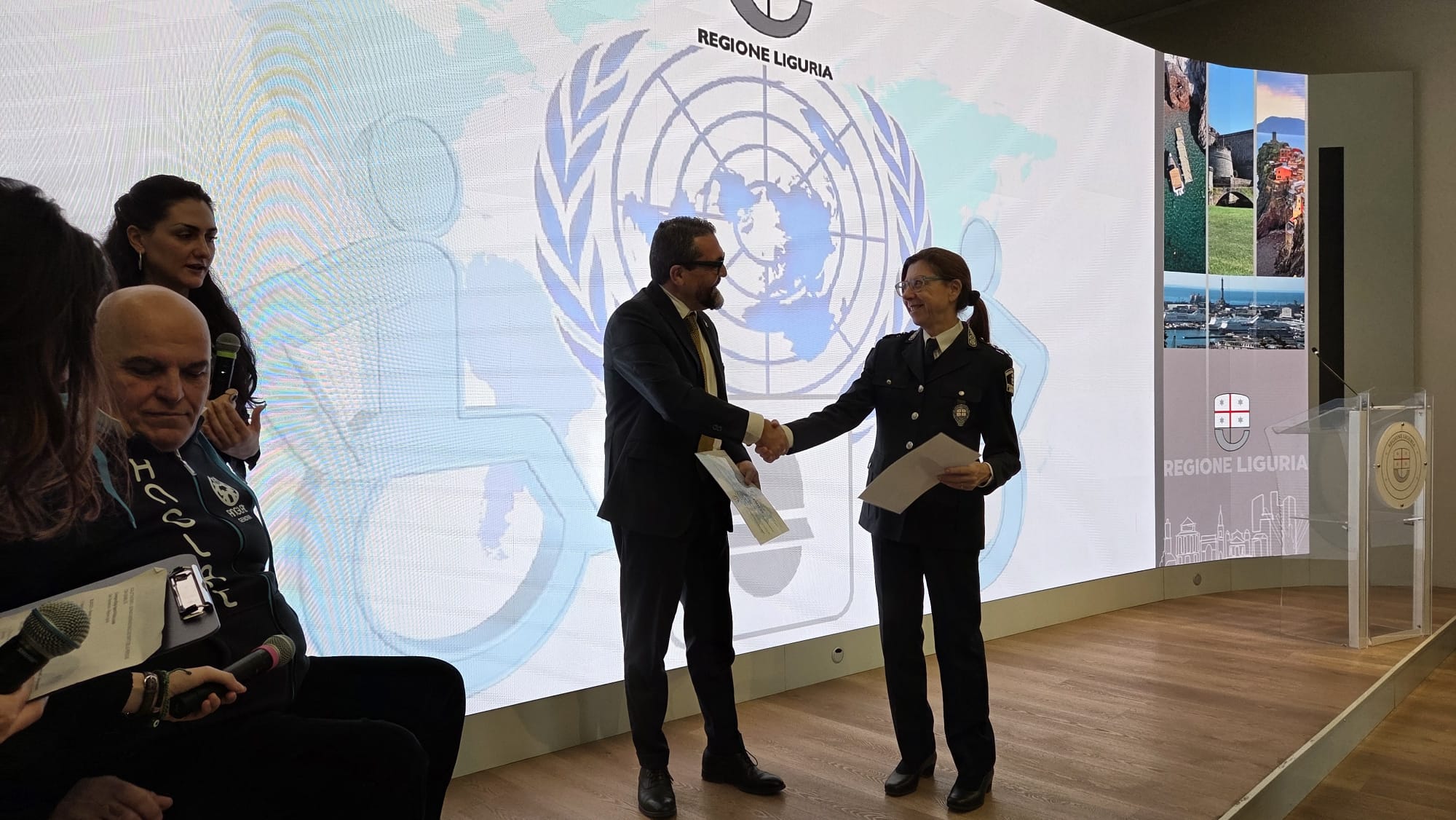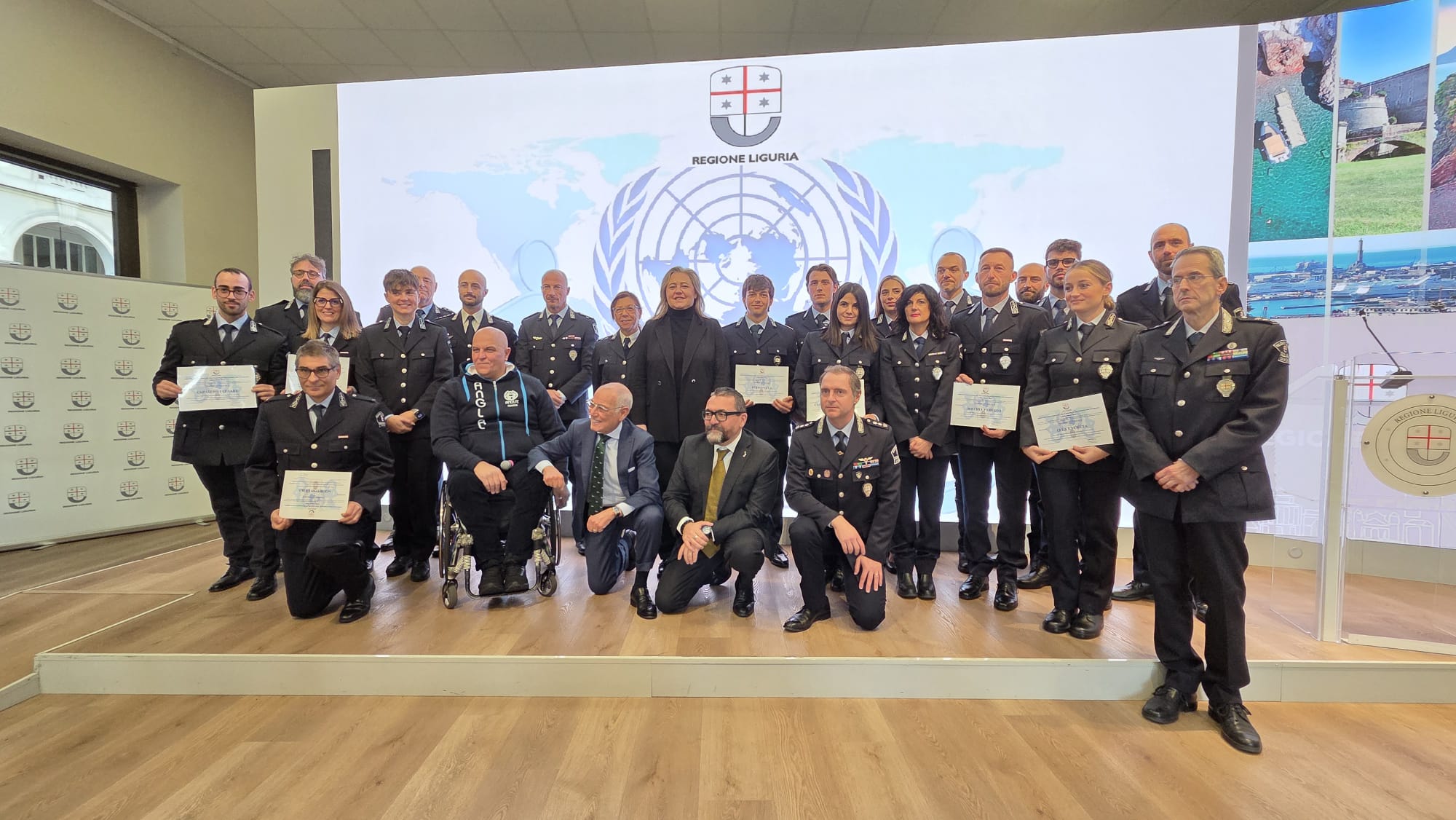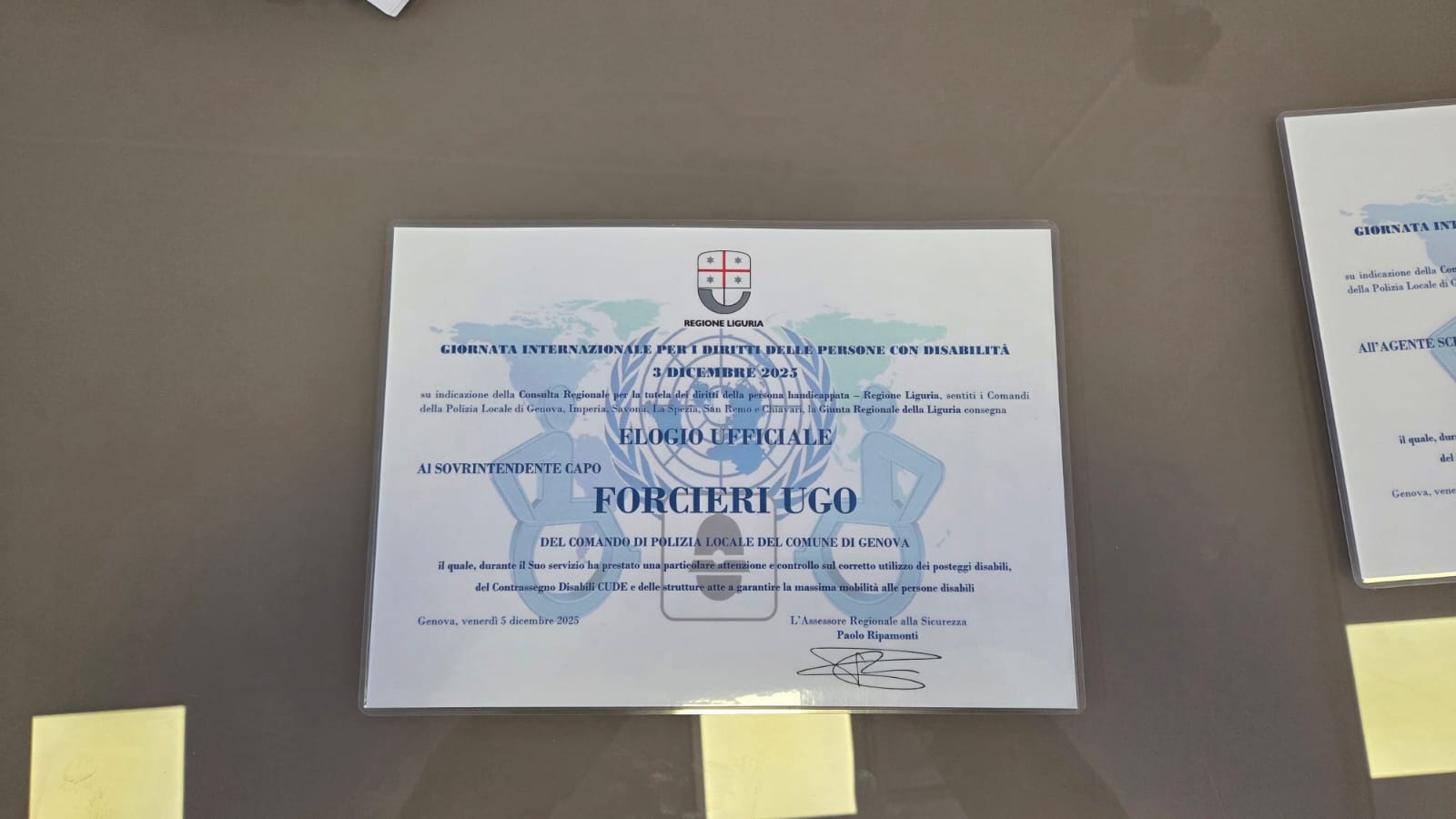 A pochi giorni dalla Giornata Internazionale delle Persone con Disabilità, celebrata il 3 dicembre, la Sala Trasparenza della Regione Liguria è diventata il palcoscenico dell'annuale cerimonia di conferimento degli elogi ad agenti delle Polizie Locali che, durante l'anno in corso, si sono distinti per l'impegno a tutela dei diritti delle persone con disabilità; fra loro, tre componenti del Corpo di Genova: Ugo Forcieri, Annalisa Scioli ed Eros Zanini.